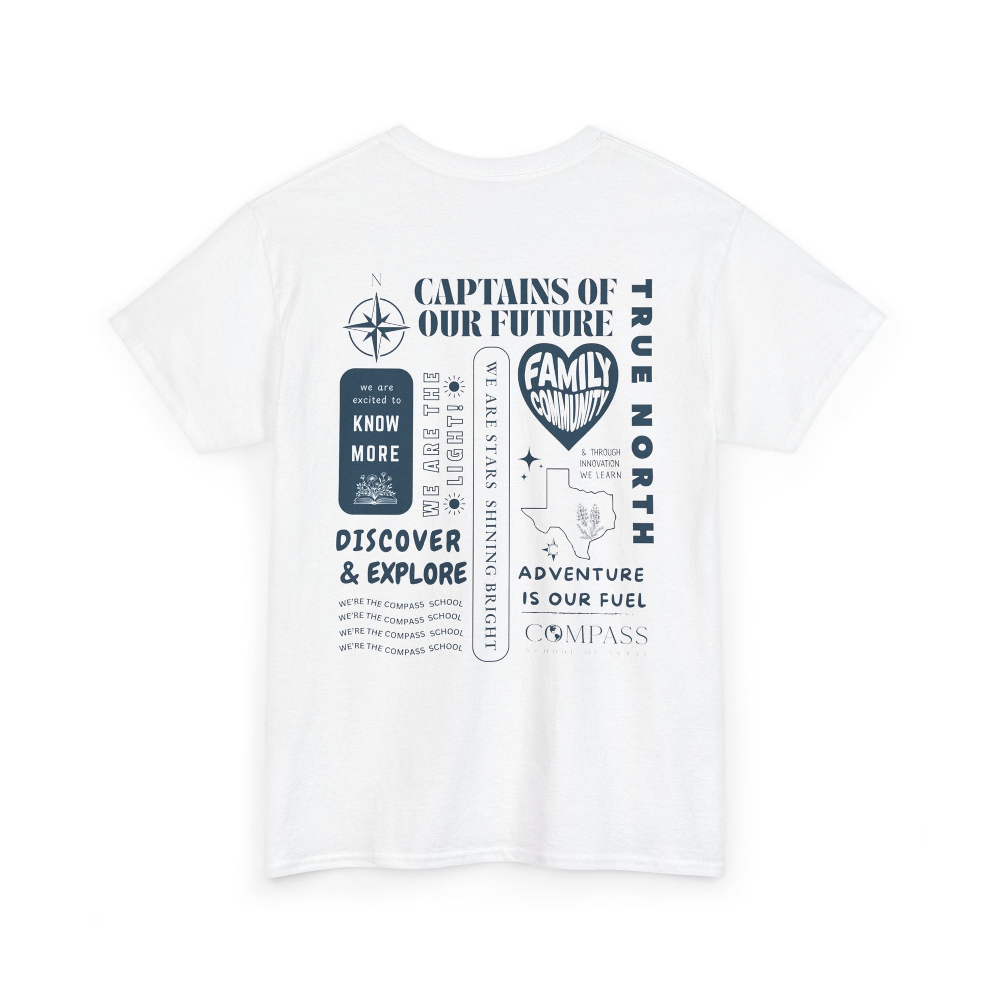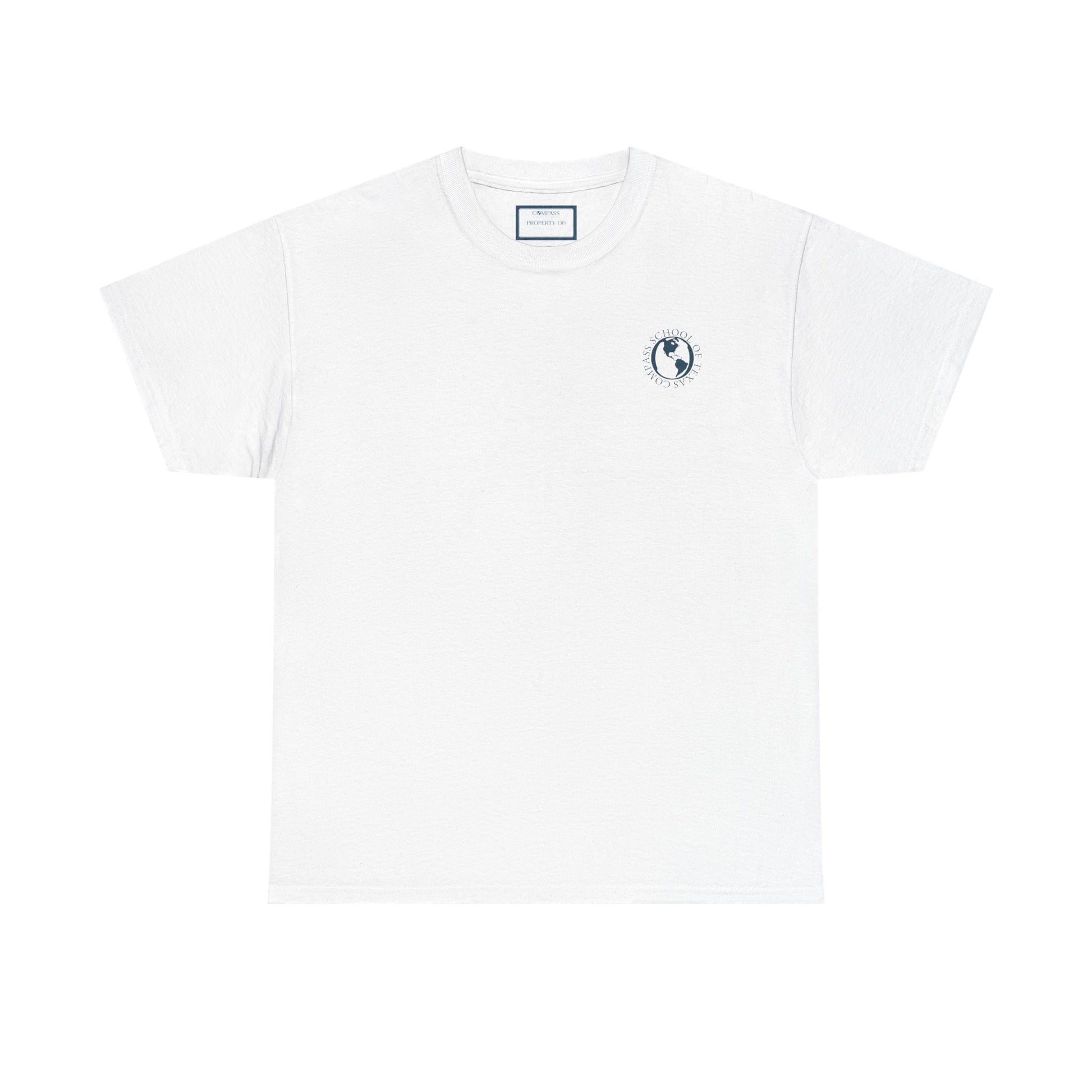 Show your school spirit with this classic white tee! Featuring the Compass School of Texas logo on the front chest and the full school song printed on the back, this shirt is perfect for students, parents, and teachers alike. Soft, comfortable, and full of pride — it’s a must-have for every Compass family.