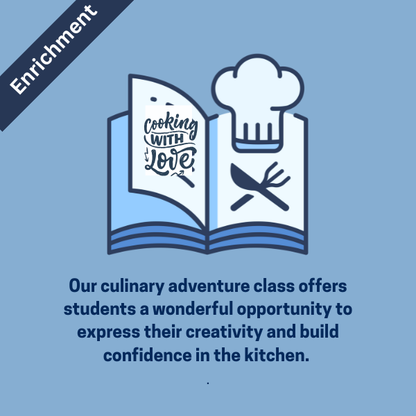 Through engaging, hands-on activities, young chefs will embark on a fascinating journey into cooking and crafting dishes that are sure to expand the palate. Students will explore a diverse array of textures, aromas, colors, and flavors, use various tools, and sharpen their fine motor skills and sensory awareness. They will learn essential kitchen skills, including measuring, mixing, spreading, and safe cutting.