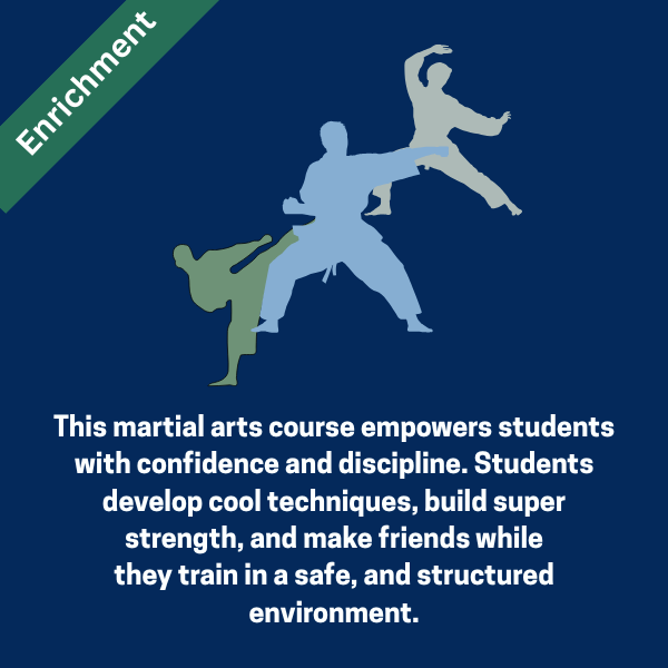 Students will have a blast mastering martial arts moves that improve their flexibility, health, and ability to focus. Expert instructors blend fun and discipline, teaching strength and self-control through carefully designed and engaging exercises.