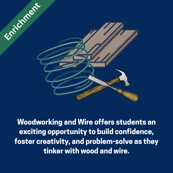 Woodworking and Wire offers students an exciting opportunity to build confidence. While wood offers a rugged and solid foundation, wire introduces movement and flexibility, allowing for dynamic, multidimensional creations. This class celebrates students' right to explore diverse materials, encouraging them to express their unique ideas and generate creative interpretations in a supportive and inspiring environment.