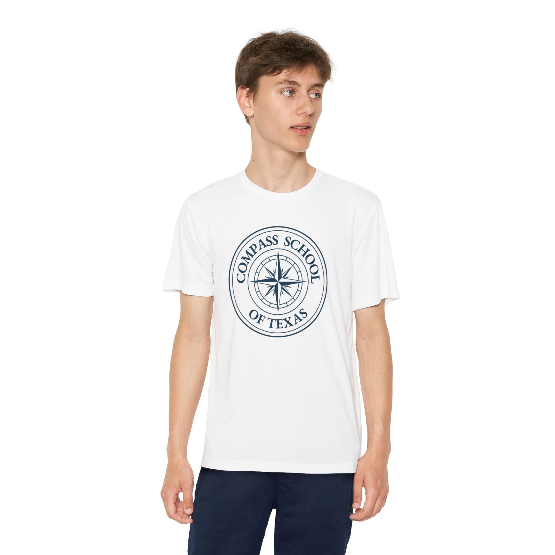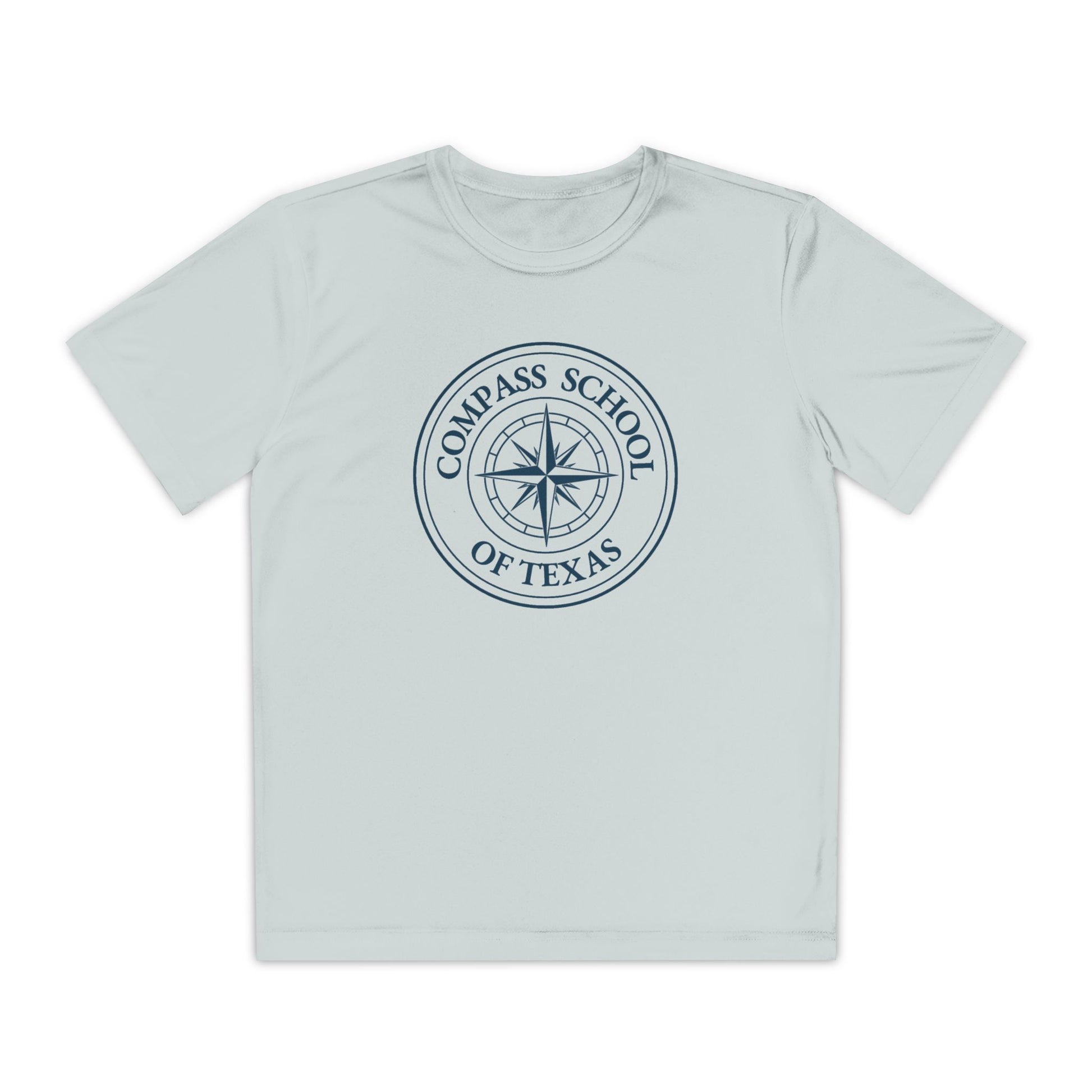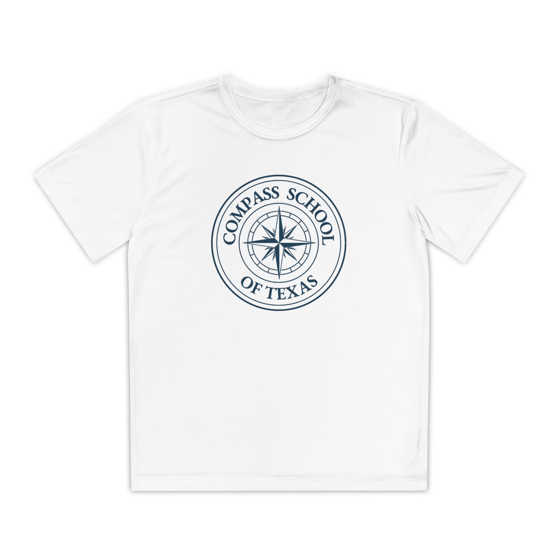 Show your school spirit in style with this performance athletic tee. Featuring a circular Compass School of Texas logo on the front chest in white and navy print, this shirt is perfect for workouts, PE, and everyday wear.